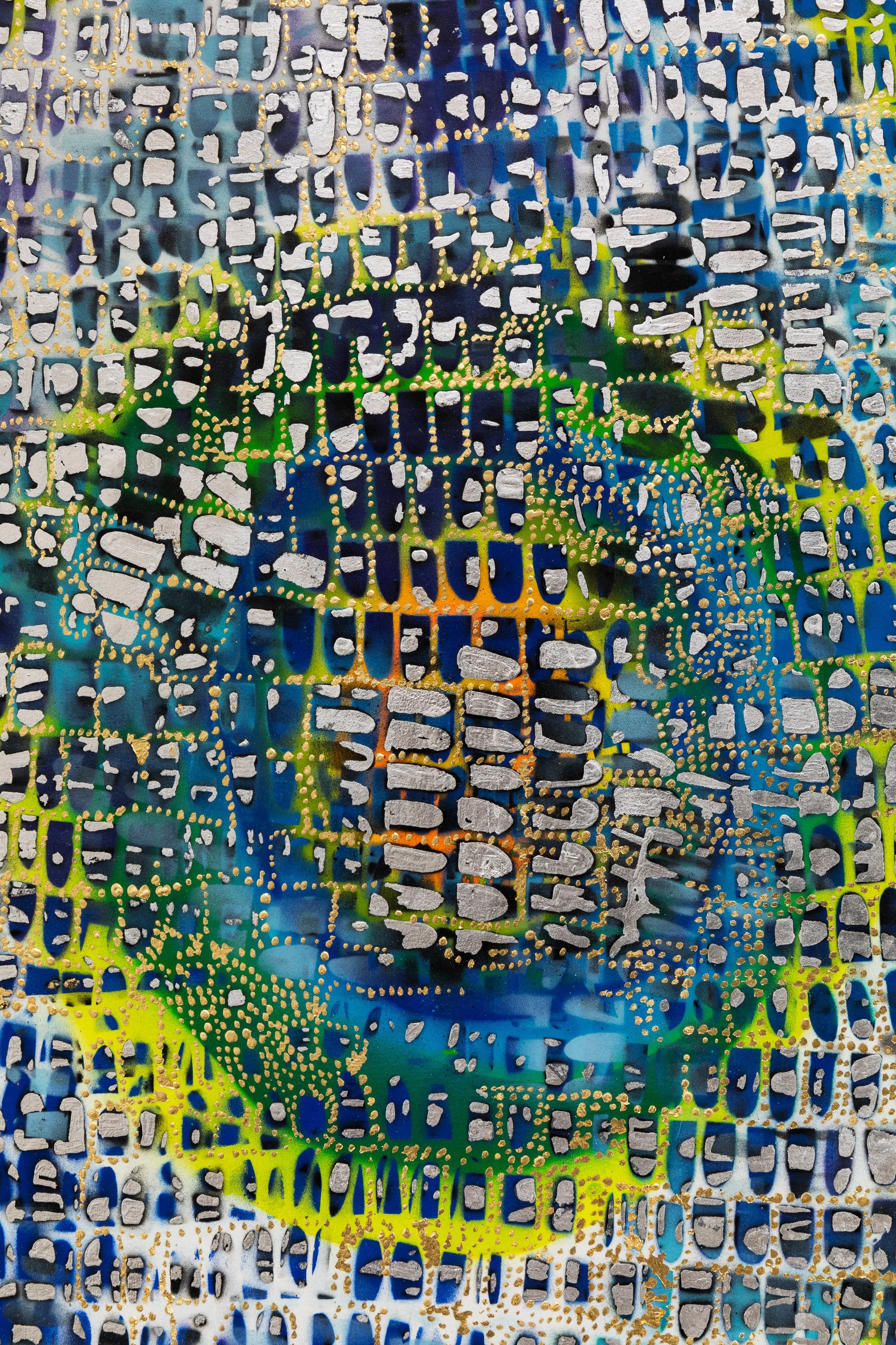 Scar of midnight portal, crystallized to blue, lime, silver and gold, 2020